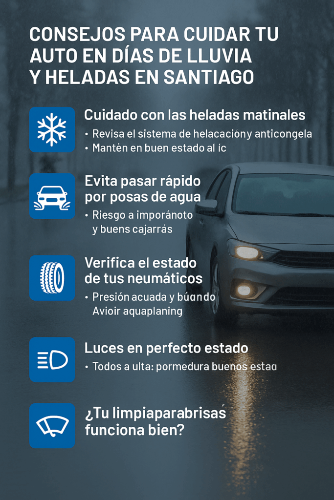 El invierno llegó con fuerza a Santiago, y con él, las lluvias intensas y las bajas temperaturas. Estos factores no solo afectan nuestra rutina diaria, sino también la salud de nuestros vehículos. Por eso, desde klassepartes, te dejamos algunos tips clave para proteger tu auto y manejar con seguridad.